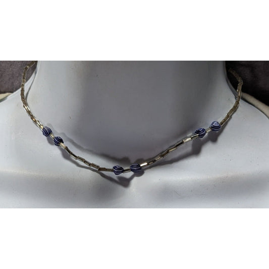 Handmade Blue Paper Wrap Bead Necklace With Gold Tone Accents