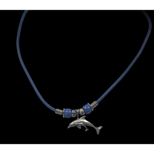 Vintage 90s Dolphin Necklace Silver Tone On Blue Rubbery Cord