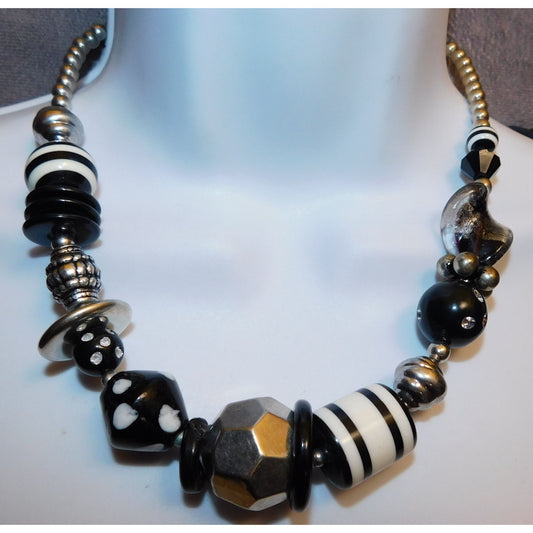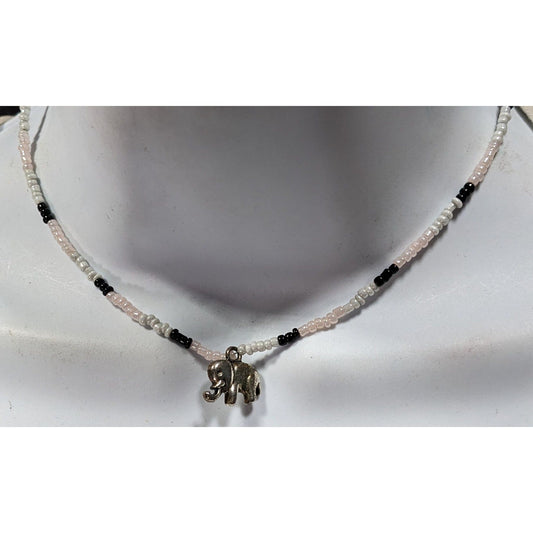 90s Bohemian Black And White Glass Beaded Necklace With Silver Tone Elephant Charm