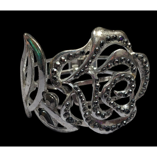 Whimsygoth Floral Black And Silver Tone Hinge Bracelet