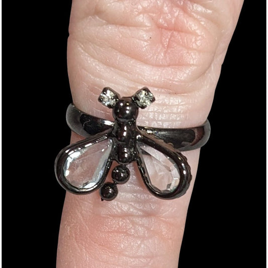 Whimsygoth Fairycore Black Dragonfly Adjustable Ring With Clear Gems