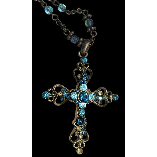 Whimsygoth Blue And Gold Tone Rhinestone Cross Necklace