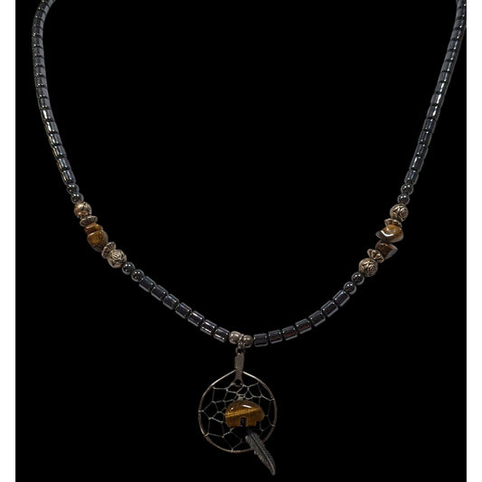 Vintage 90s Native Hematite And Tiger Eye Dream Catcher Necklace With Bear Fetish