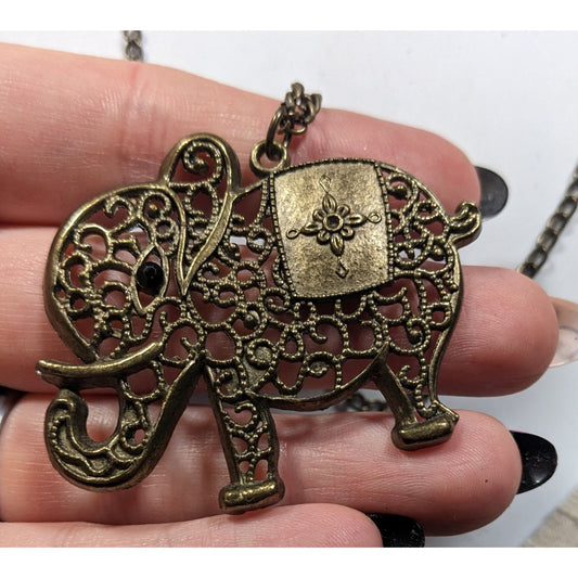 Vintage Bohemian Filigree Elephant Pendant Antiqued Gold Tone With Black Rhinestone Eye