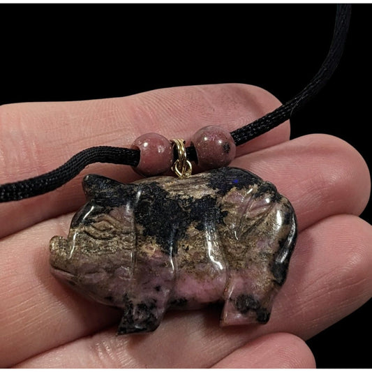 Carved Pink And Black Rhodonite Pig Pendant Necklace