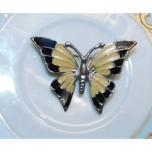 Vintage Black And Beige Butterfly Brooch