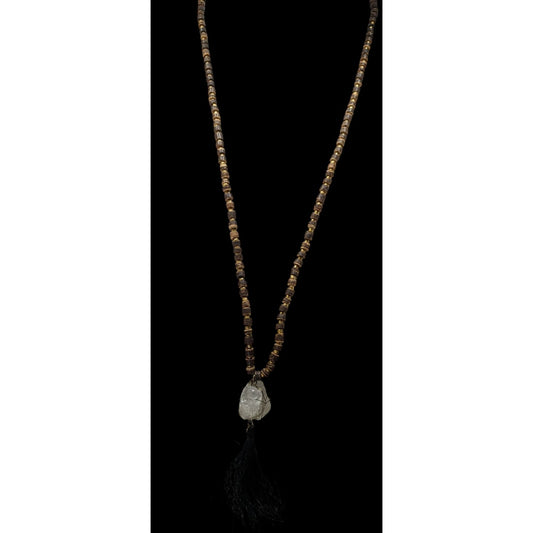 Vintage Bohemian Beaded Necklace With Natural Crystal Pendant & Black Tassel