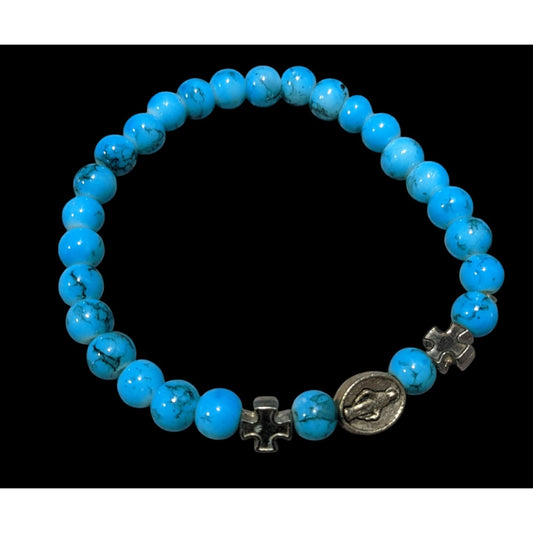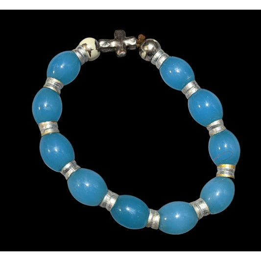 Blue Glass And Silver Tone Cross Beaded Stretch Charm Bracelet