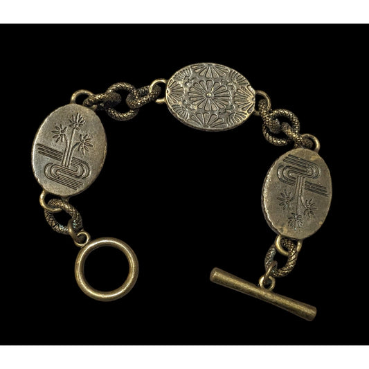 Vintage Antiqued Gold Tone Floral Etched Cabochon Bracelet