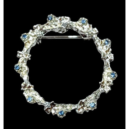 Dainty Blue And Silver Floral Rhinestone Wreath Brooch