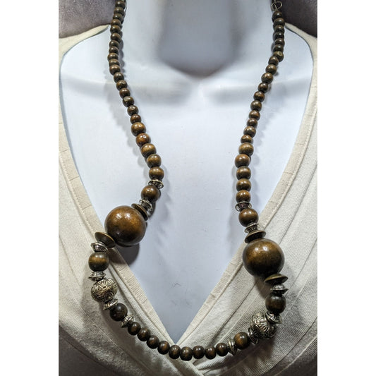 Vintage Wooden Beaded Necklace With Silver-Tone Accents & Adjustable Chain