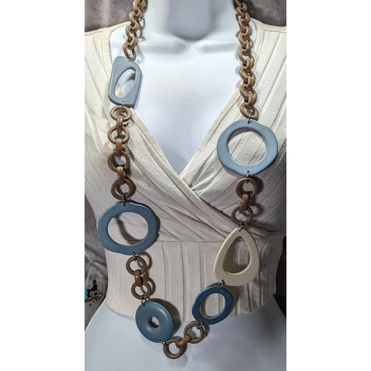 Retro Chunky Link Necklace With Large Blue & Beige Resin Geometric Shapes