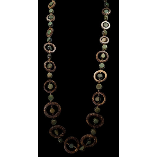 Handcrafted Wooden Brown And Green Disc Necklace With Circular Accents