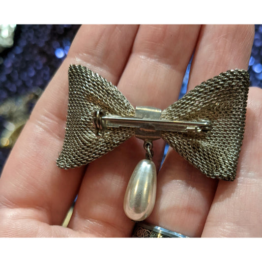 Vintage Coquette Mesh Silver Tone Bow Brooch