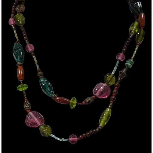 Handmade Cottagecore Pink And Green Layered Glass Beaded Necklace