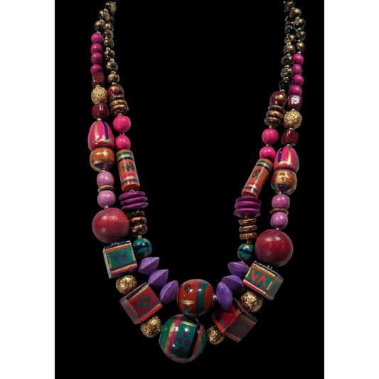 Vintage Rainbow Hand Painted Wood Beaded Necklace