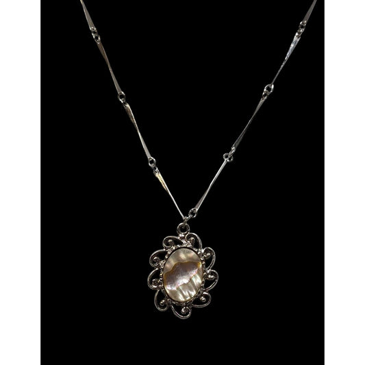 Vintage Mother Of Pearl Oval Pendant Necklace With Ornate Detailing
