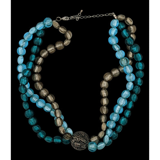 Vintage Handmade Glass Beaded Necklace Blue And Silver Tone With Floral Metal Accent