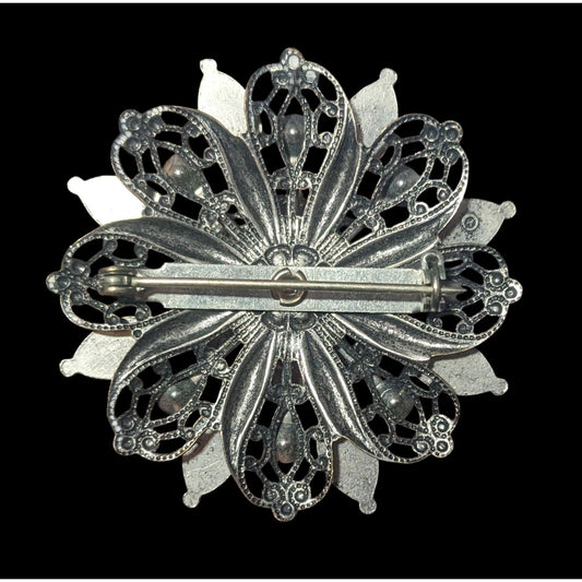 Vintage Metal Black And White Floral Brooch