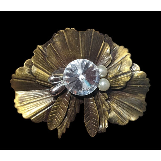 Vintage Floral Gold/Silver Tone Faux Pearl Rhinestone Floral Brooch