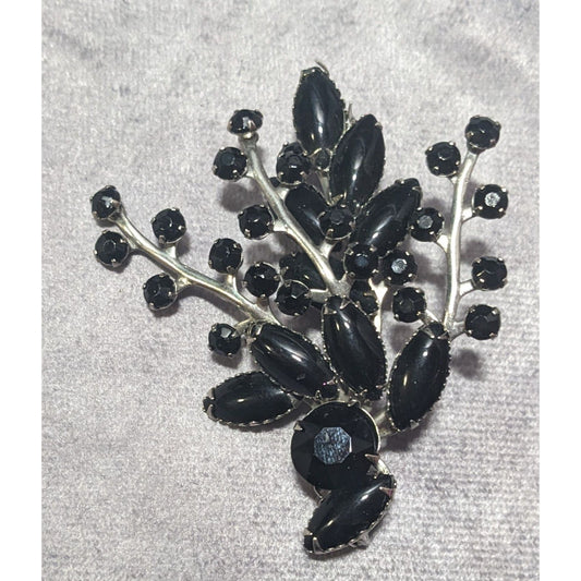 Vintage Floral Spray Black Gemmed Gothic Brooch