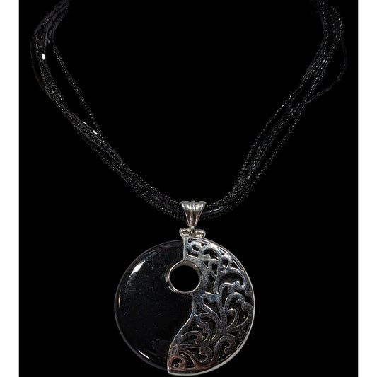 Floral Overlay Black And Silver Tone Pendant Necklace With Black Glass Beads