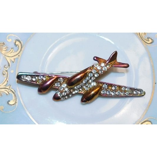 Vintage Anodized Airplane Brooch With Rhinestone Accents