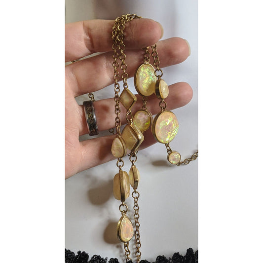Iridescent Faux Opal Long Gold Chain Necklace With Faceted Accents