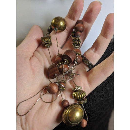 Vintage Bohemian Brutalist Multi-Strand Brown Cord Necklace With Antiqued Gold Tone Chain & Metal Beads 33