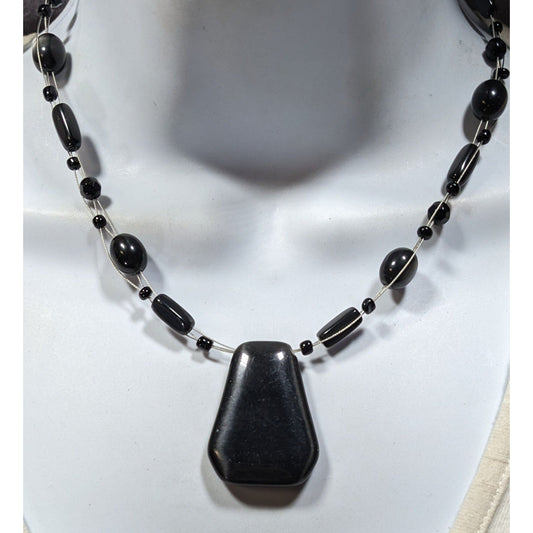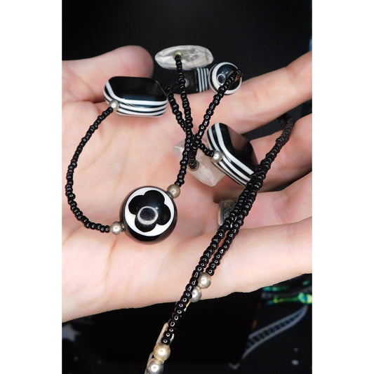 Gothic Black Cateye Glass Beaded Necklace With Geometric Pendant & Adjustable Chain