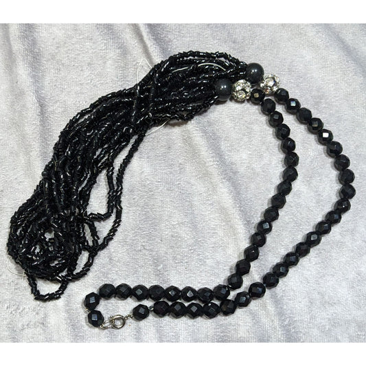 Glam Goth Black Multi-Strand Beaded Necklace With Crystal Accents