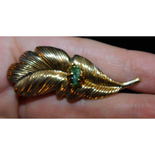 Vintage 1950s Feather Brooch With Prong Set Jade Accents