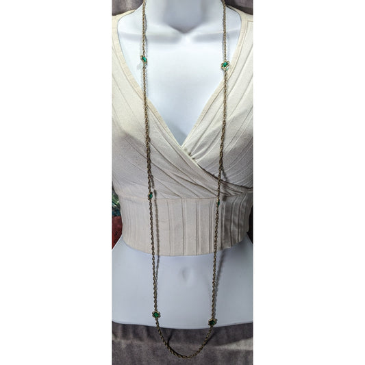 Vintage Floral Long Gold-Tone Rope Chain Necklace With Green Flower Accents