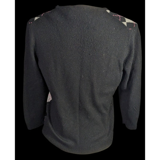 Preppy J.Crew Vintage Womens Cashmere Argyle Cardigan Sweater - Black/Gray/Pink