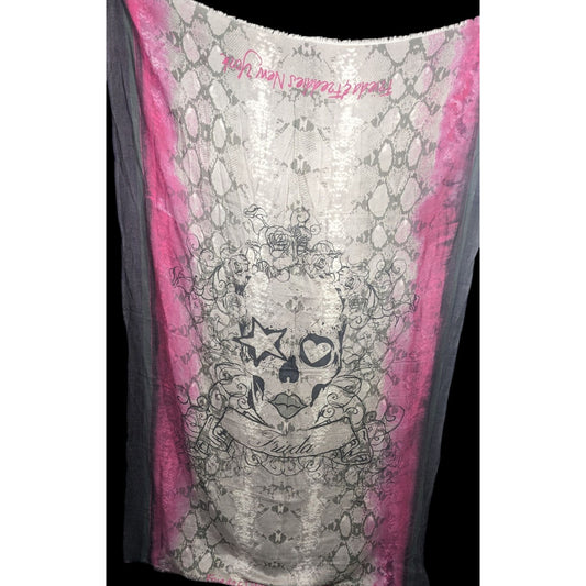 Frida & Freddies New York Gothic Skull Scarf 70% Viscose 30% Wool 45x72 Inches Pink & Gray Snake Print With Floral Accents