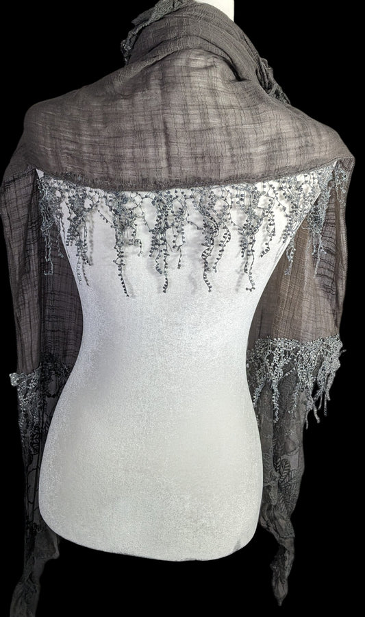 Victorian-Inspired Vintage Whimsygoth Gray Scarf With Lace Detail Distressed Look