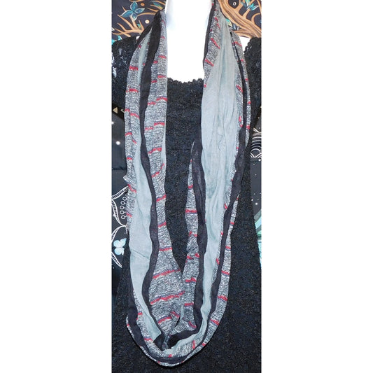 Do Everything In Love Infinity Scarf With Mixed Gray Stripes Red Accents & Black Trim