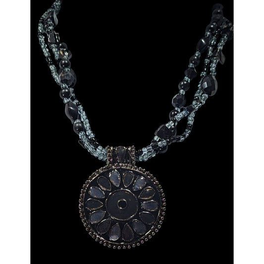 Black And Grey Multilayer Beaded Floral Medallion Pendant Necklace