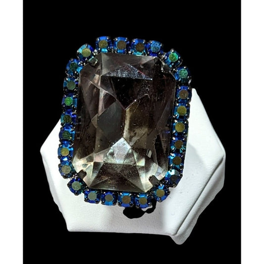 Chunky Glam Goth Grey And AB Blue Glass And Rhinestone Stretch Ring
