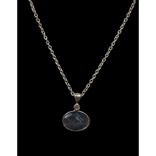Whimsical Grey Faceted Cat Eye Glass Pendant Necklace With Rhinestone Accent