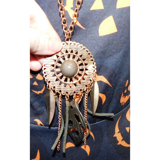Bohemian Medallion Necklace Grey And Gold Tone With Fringe