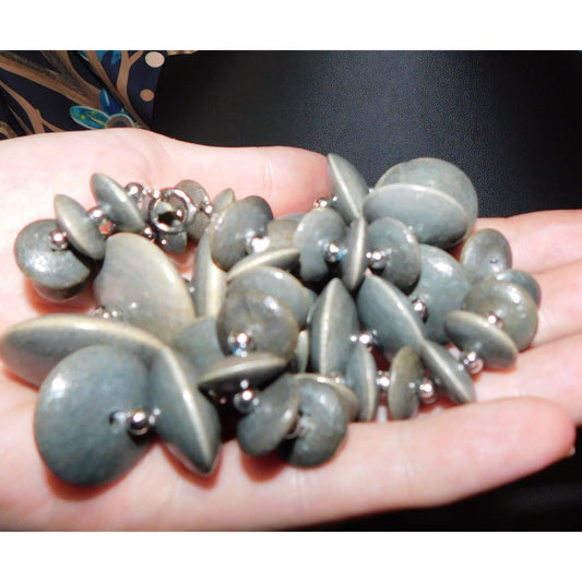 Retro Grey Wooden Disc Necklace With Silver Tone Accents