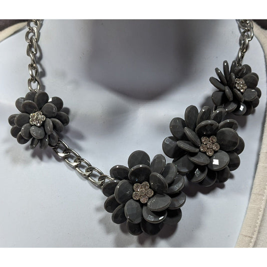Floral Cottagecore Grey And Silver Tone Necklace With Rhinestone Accents