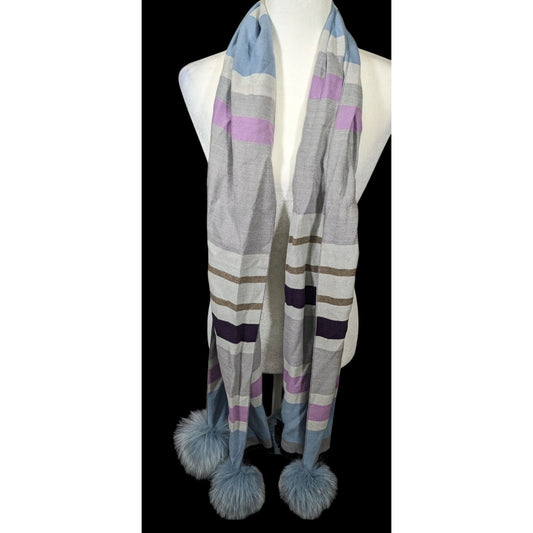 Casual Grey Purple And Blue Striped Pompom Scarf