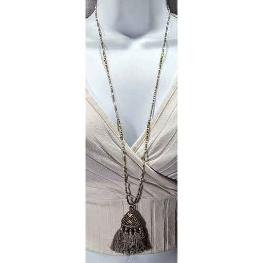 Handmade Boho Grey And Gold Tone Glass Beaded Thread Tassel Necklace