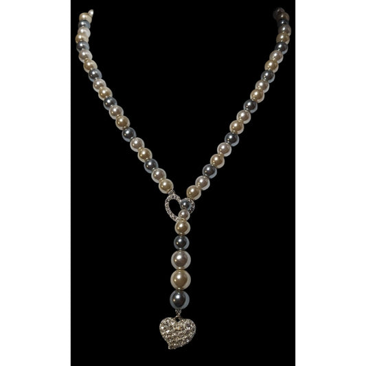 Vintage Avon Grey And White Faux Pearl Silver Tone Rhinestone Heart Lariat Necklace