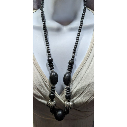 Vintage Black Wood Silver Accent Statement Artisan Necklace Handcrafted Ethnic Boho