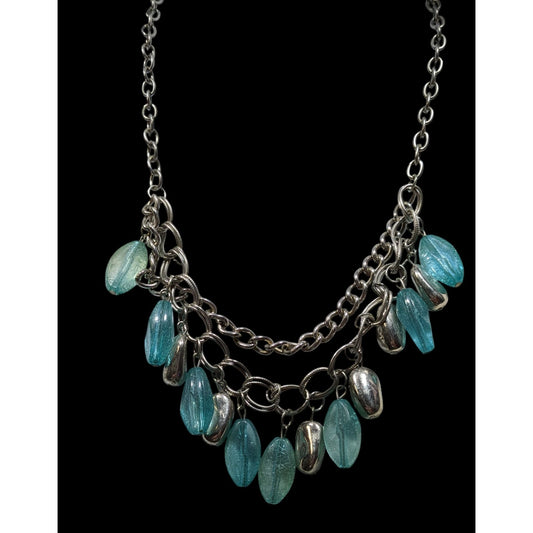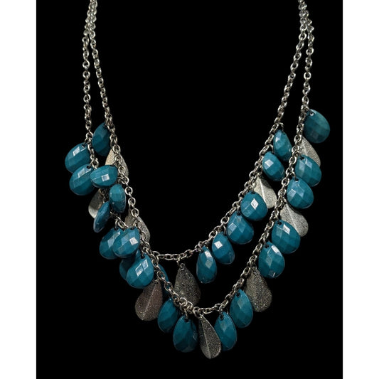 Layered Silver-Tone Chain Necklace With Turquoise Teardrop Beads & Glittery Silver Accents