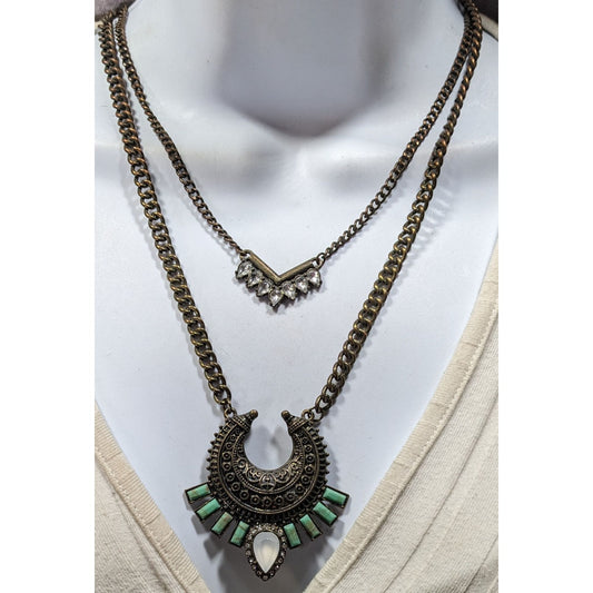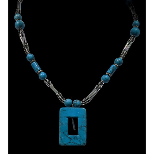 Geometric Faux Turquoise Pendant Necklace With Beaded Chain & Adjustable Clasp