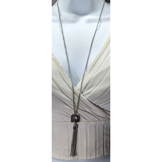 Geometric Brustalist Hammered Silver Tone Tassel Necklace